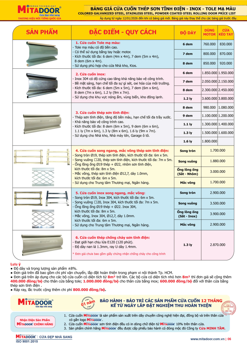 Mitadoor gửi đến quý khách hàng bảng giá Cửa cuốn thép sơn tĩnh điện - Inox - Tole mạ màu mới nhất, áp dụng từ ngày 12/01/2026 đến khi có bảng giá mới được thay thế.