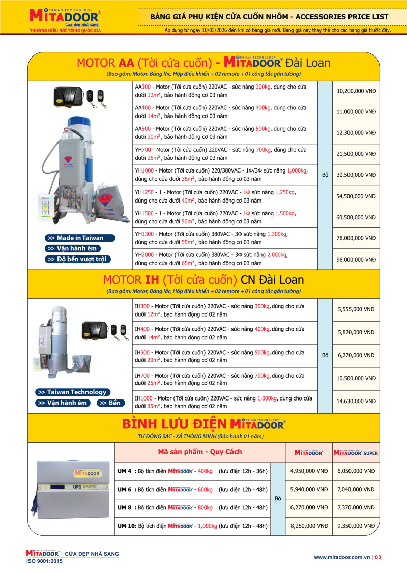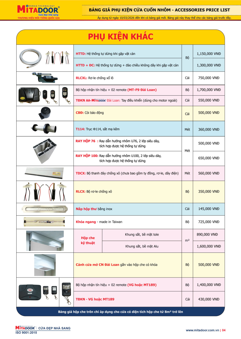 Mitadoor gửi đến quý khách hàng bảng giá Phụ kiện cửa cuốn nhôm Mitadoor mới nhất, áp dụng từ ngày 10/03/2026 đến khi có bảng giá mới được thay thế.