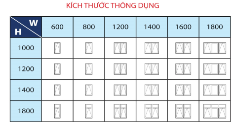 Kích thước thông dụng cửa sổ mở hất hệ nhôm Mitadoor DP