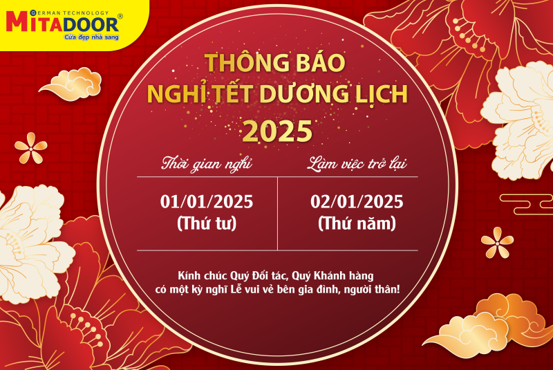 Công ty Cửa Mitadoor xin trân trọng gửi đến Quý Khách hàng lịch nghỉ Tết Dương lịch 2025 vào ngày 01/01/2025 - Thứ 3; Công ty sẽ đi làm lại vào ngày Thứ 4 - 02/01/2025.