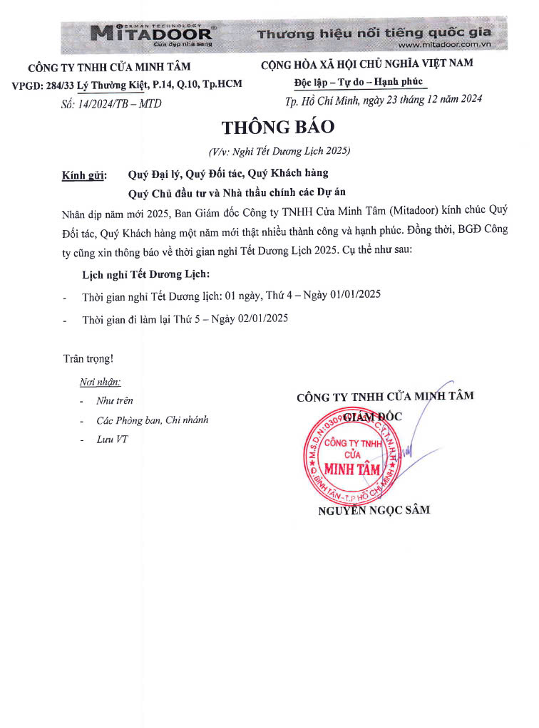 Công ty Cửa Mitadoor thông báo lịch nghỉ Tết Dương lịch 2025 vào ngày 01/01/2025 - Thứ 3.
