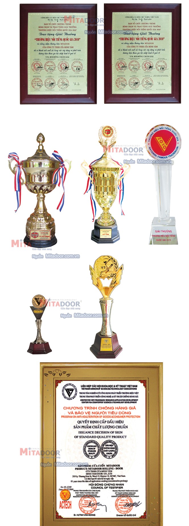 Cùng với việc phát triển hệ thống sản phẩm đa dạng, hoàn thiện cơ cấu tổ chức Công ty và chuẩn hóa quy trình phục vụ khách hàng, liên tiếp trong nhiều năm từ 2009, MitaDoor đã nhận được nhiều giải thưởng cao quý: CÚP VÀNG THƯƠNG HIỆU VIỆT, SẢN PHẨM CHẤT LƯỢNG CHUẨN, TOP 100 SẢN PHẨM ƯU TÚ HỘI NHẬP.