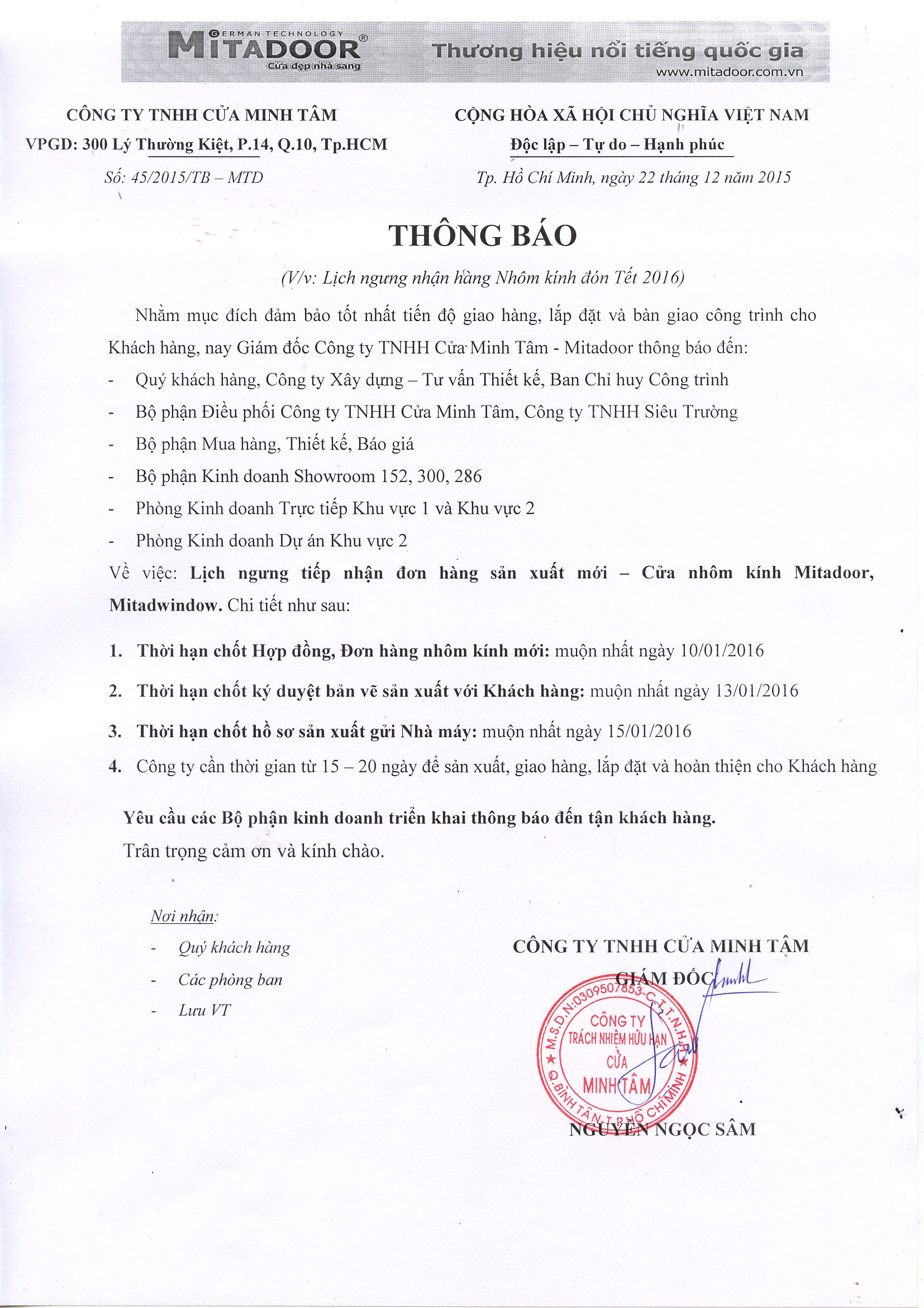 THÔNG BÁO LỊCH NGƯNG NHẬN HÀNG NHÔM KÍNH ĐÓN TẾT 2016