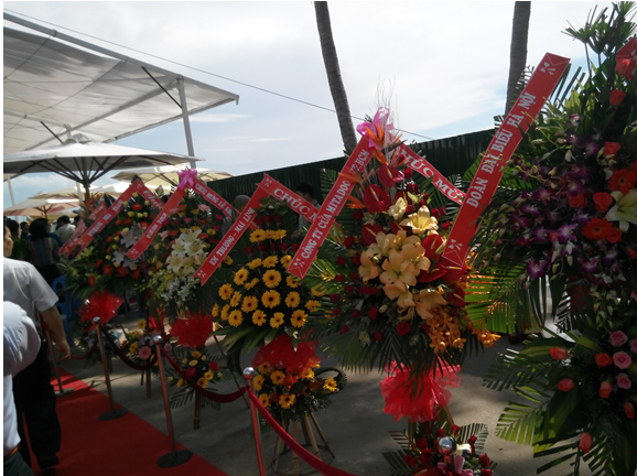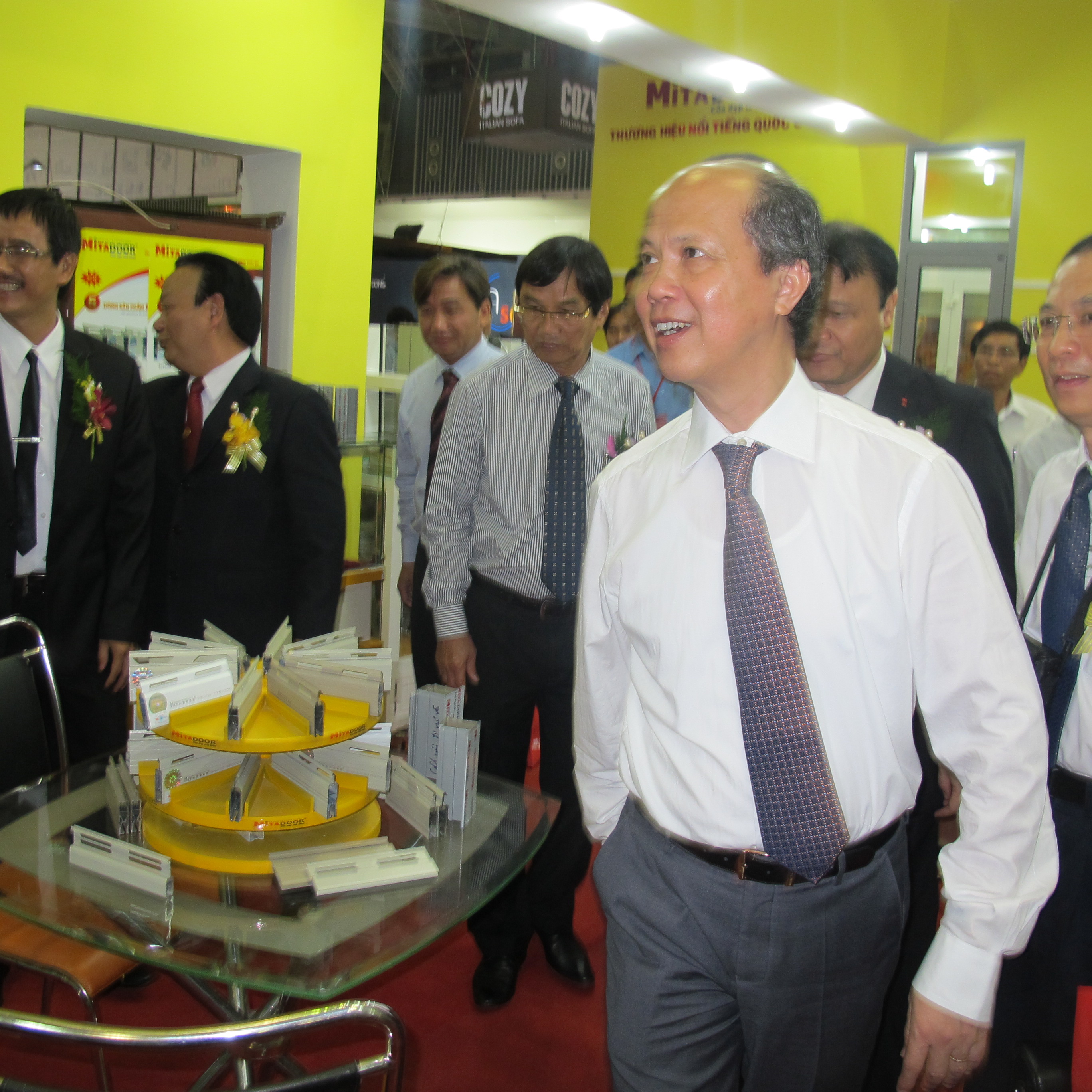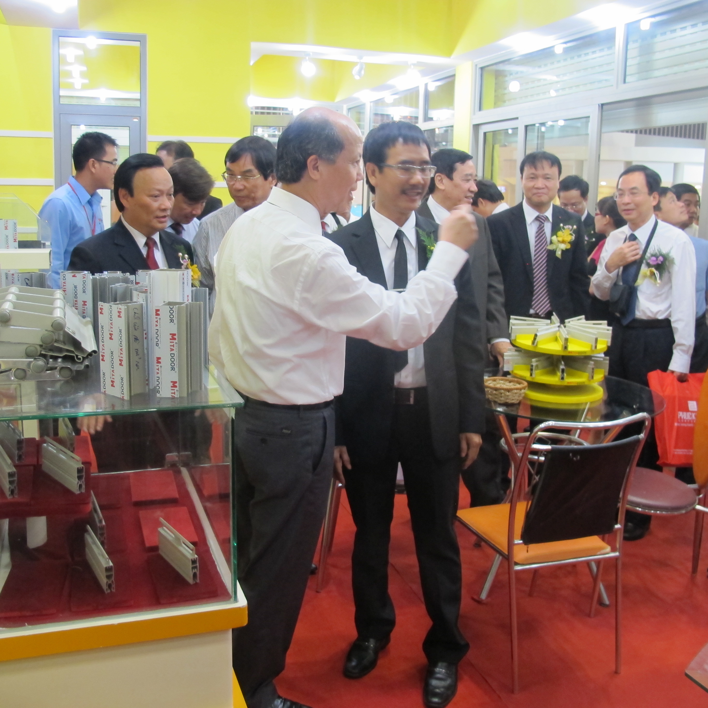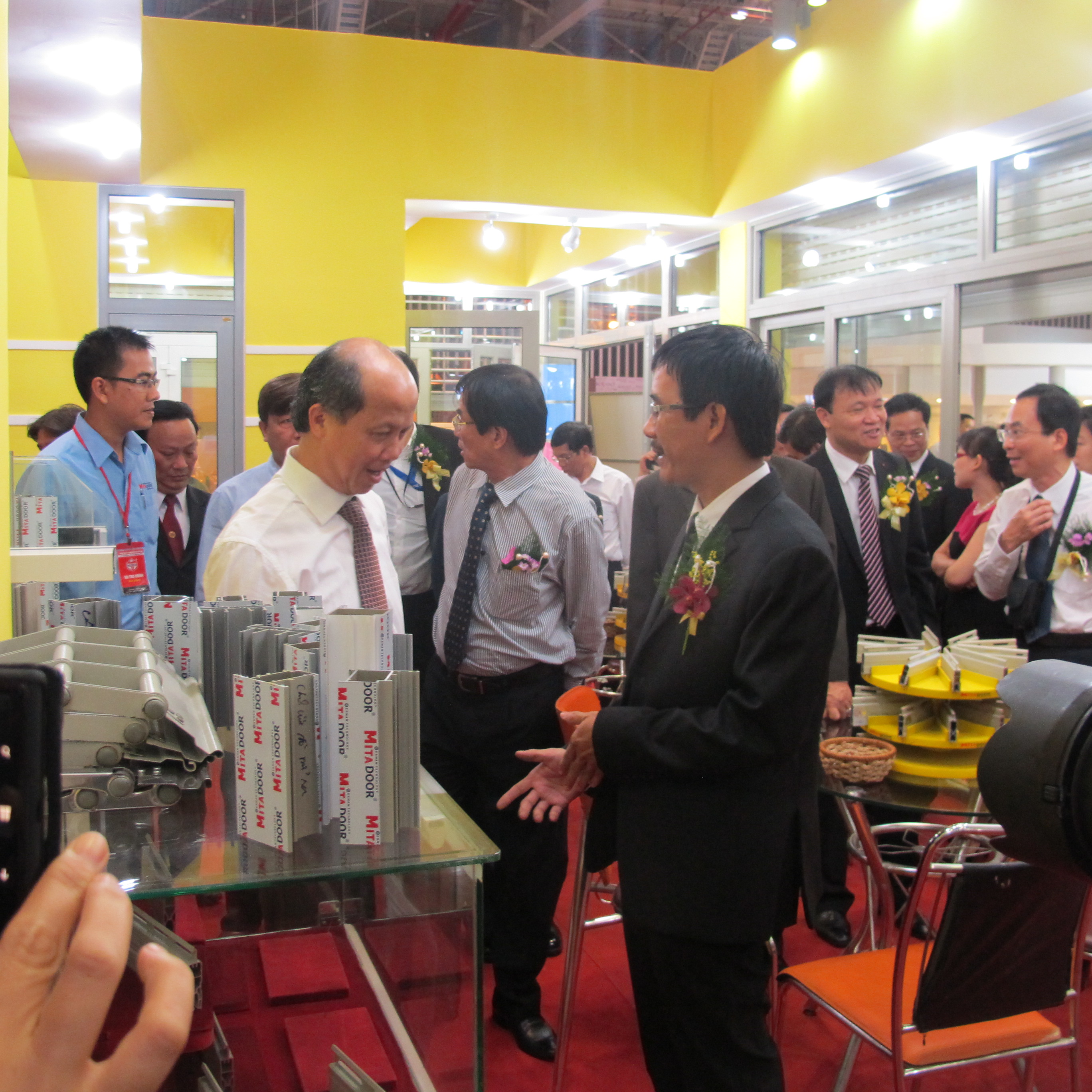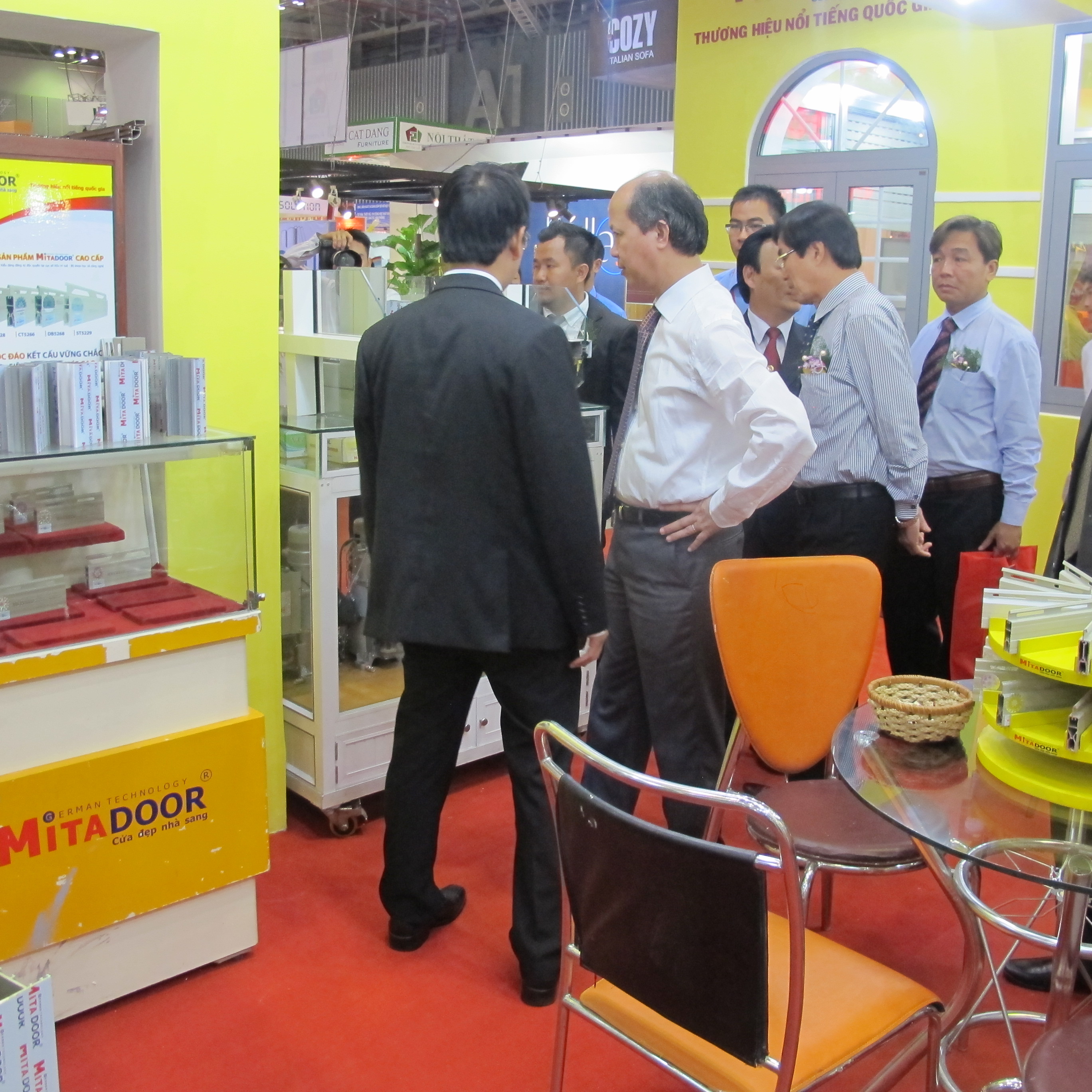 Thứ trưởng Bộ Xây Dựng – Ông Nguyễn Trần Nam (Người mặc áo trắng), Chủ tịch HĐQT Công ty CP Triển lãm Quốc tế VIETBUILD – Ông Nguyễn Đình Hùng (Người mặc áo vest đen thứ 3 từ trái sang) và Giám Đốc Công ty MITADOOR – Ông Nguyễn Ngọc Sâm (Người deo mắt kính)