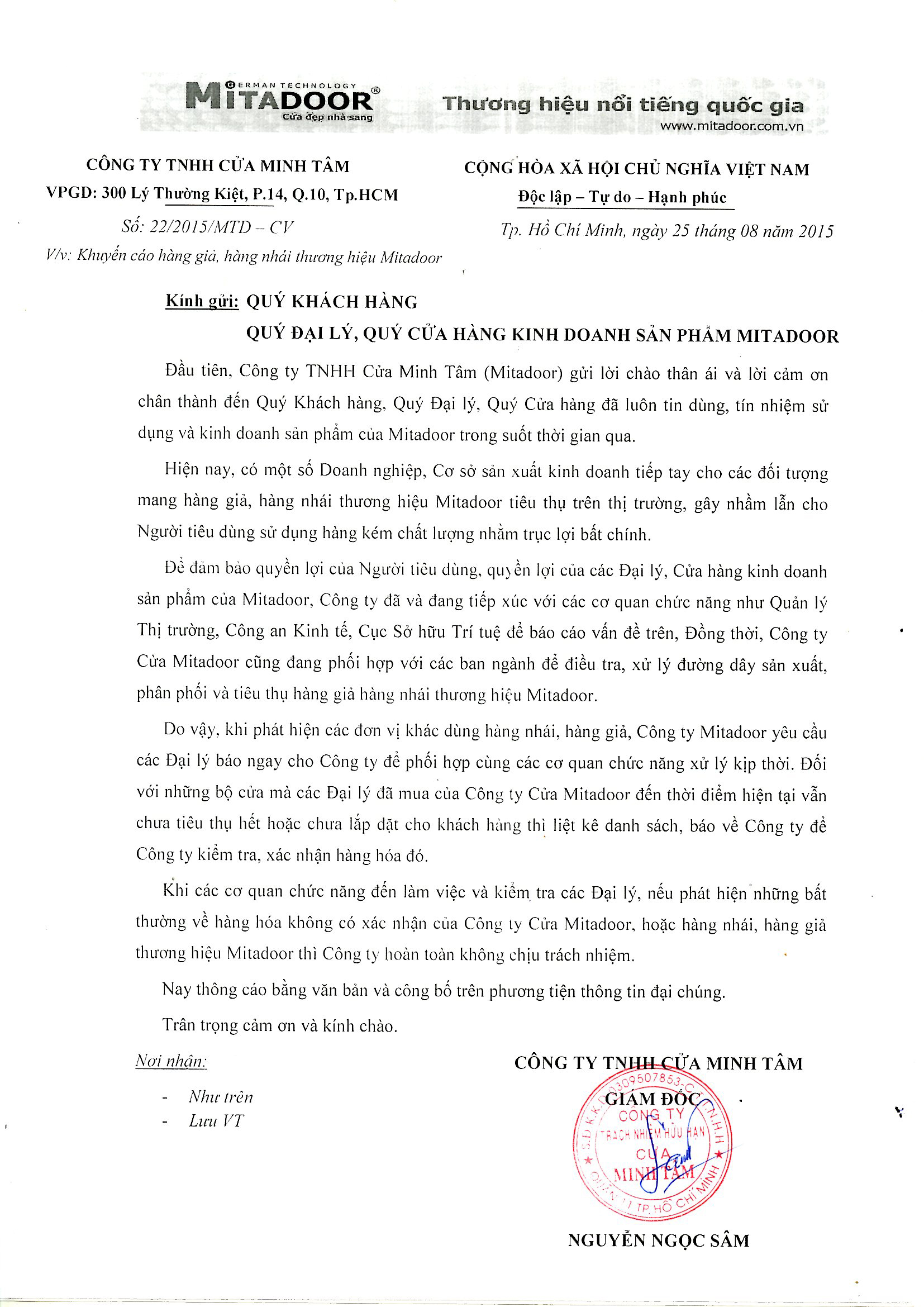 Đầu tiên, Công ty TNHH Cửa Minh Tâm (Mitadoor) gởi lời chào thân ái và lời cảm ơn chân thành đến Quý Khách hàng, Quý đại lý, Quý cửa hàng đã luôn tin dùng, tín nhiệm sử dụng và kinh doanh sản phẩm của Mitadoor trong suốt thời gian qua.